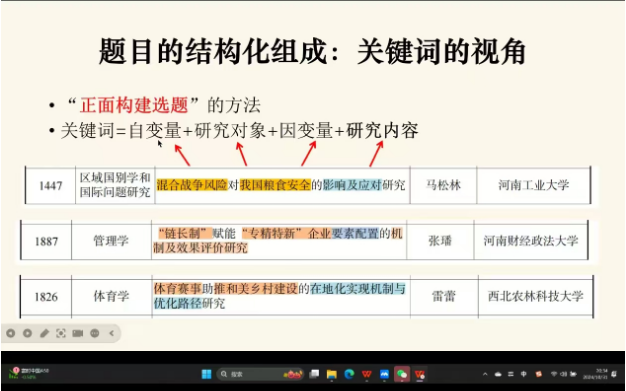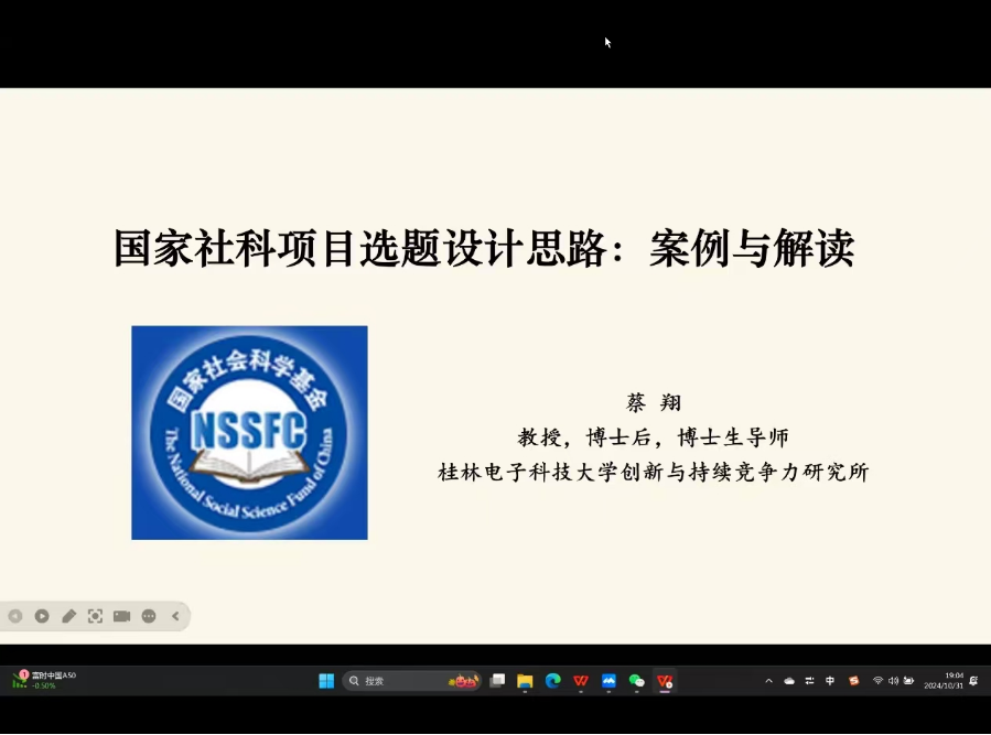 (通讯员 谢薇)为了帮助学院师生更好地理解国家社科项目的申报要求,提升选题质量,推动科研创新与学科发展。10月31日19:00,我院通过腾讯会议举行了长江经管讲坛第六十五讲,桂林电子科技大学软科学研究院副院长蔡翔受邀宣讲,针对国家社科项目的选题设计思路进行了全面而深入的解读。williamhill中国副院长裴潇、教师代表、2023级和2024级研究生到场参会。本次会议由副教授周欣星主持。