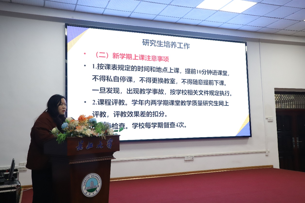 会议伊始,学院党政领导班子成员分别从科研工作、制度废改立、聘期考核、研究生培养、学位点评估、研究生招生、财务工作、本科教学评估、本科教学常规考核、人才培养、服务地方经济社会发展等十一个方面的工作进行了新学期的工作部署。