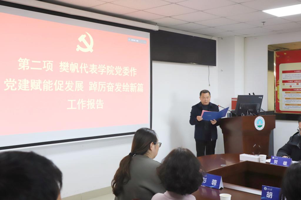 会议在庄严的国歌声中拉开帷幕。会议听取并审议了樊帆代表上一届党委作题为《党建赋能促发展,踔厉奋发绘新篇》的工作报告。报告全面总结了学院党委四年来的主要成绩和经验,客观分析了学院党委工作中面临的主要问题,提出了学院党委今后一段时期的工作设想。报告指出,今后四年是深入学习贯彻党的二十大精神、省第十二次党代会精神的关键阶段,是深入推进学院高质量发展的攻坚阶段。党委将继续强化党建引领作用,推动学院高质量发展;强化突出政治建设,夯实管党治党责任;强化党员榜样作用,实干奉献有新作为;强化党委服务意识,提高服务师生质量,切实做好党建引领、政治建设、榜样树立、服务师生等工作。