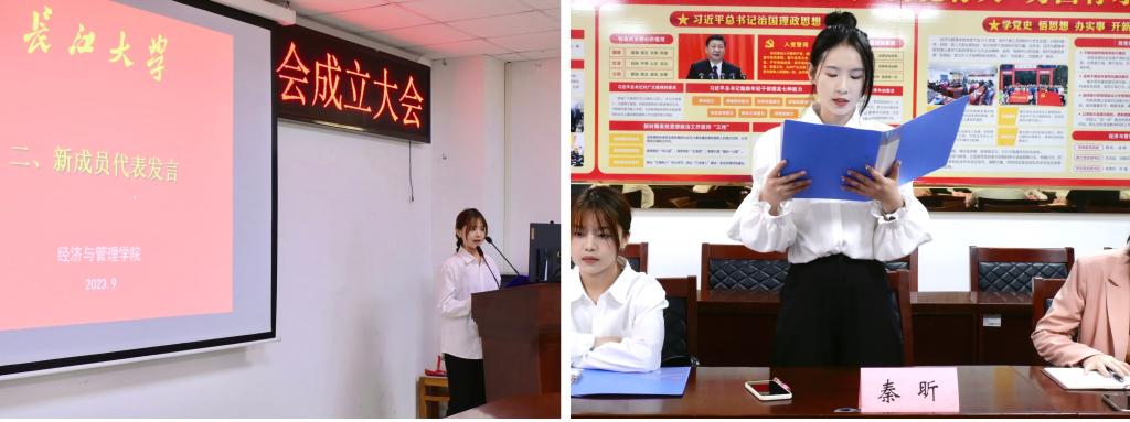 大会伊始,参会同学依次进行自我介绍。大会第二项,新成员代表王亚楠阐述了自己加入研究生会的原因与动力,并庄严承诺将积极履行自己的职责,展示自己,服务同学。大会第三项,主席团代表秦昕的发言中分享了对研究生会未来的展望:要明确自身职责,加强组织管理,突出经管学院的特色,塑造独特的研会形象。