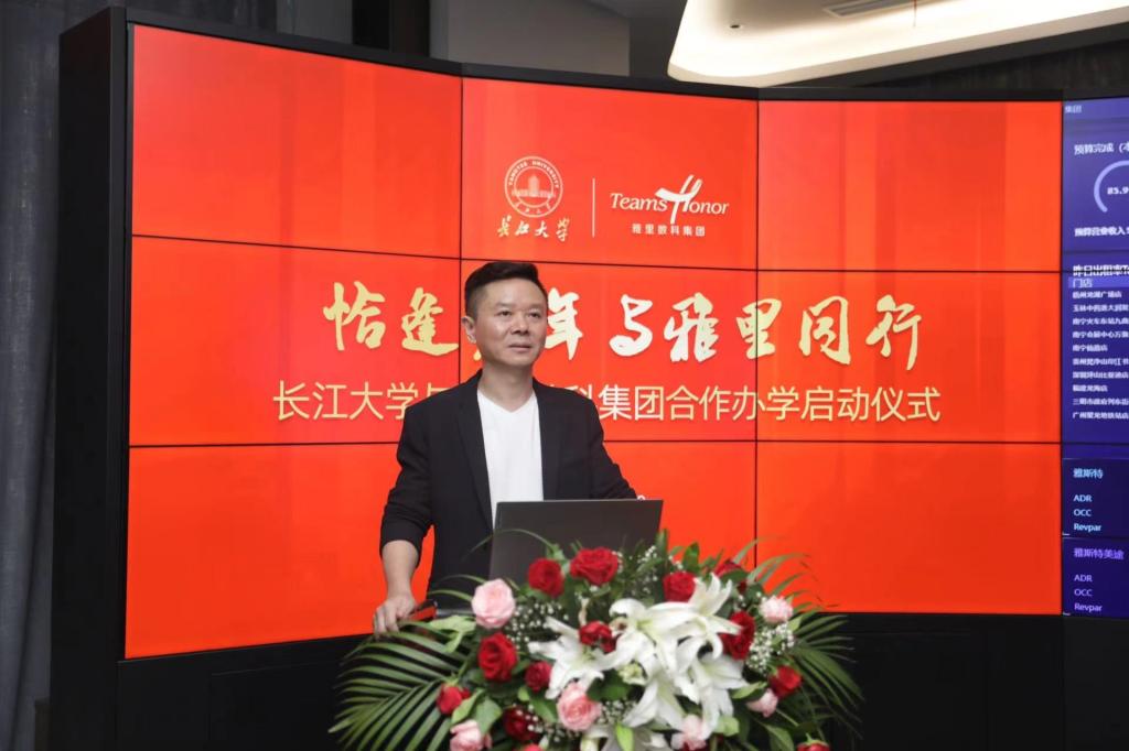 会议开始,陈承教授就本次参会人员进行介绍,并着重介绍了胡竞选董事长。随后徐辉院长致欢迎词,表达了学校和学院对胡董事长的热烈欢迎和诚挚感谢,徐院长就Williamhill威廉希尔的办学历史、人才培养和威廉希尔建设以及学院基本情况等方面进行了介绍。紧接着胡董事长介绍了雅里数科集团是一家以酒旅服务为中心,定位于年轻消费群体、借助数字化手段运营的企业,胡董就公司整体运作方式,以及人才培养体系等进行了详细介绍。