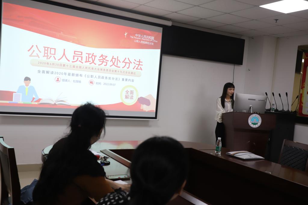 法学院杜厚扬博士应邀为全体教职工党员做纪法知识专题宣讲。杜博士从制定政务处分法的必要性、起草的过程与思路、政务处分法的构成体系、政务处分法重点条文解读四个方面,为全体党员老师全面解读了最新颁布的《公职人员政务处分法》。