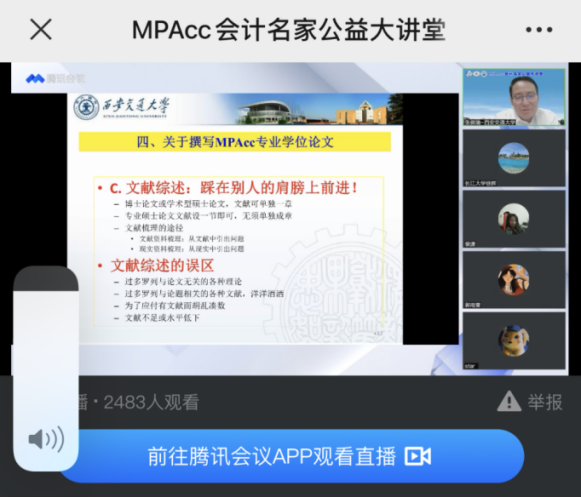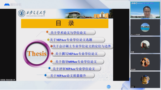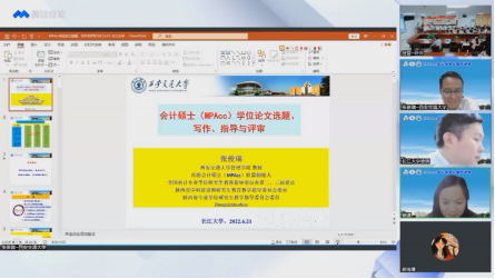 张教授则首先感谢了中国会计学会、全国会计专业学位研究生教育指导委员会和Williamhill威廉希尔提供的这次交流机会,并祝贺我院会计学成为国家级一流本科专业建设点;随后,他从学术论文与学位论文的区别谈起,给出了MPAcc学位论文研究类型的选择建议,重点对MPAcc学位论文的选题、定位与边界进行了阐述,指出MPAcc学位论文应紧密结合会计实务;接着,张教授围绕MPAcc学位论文的撰写、指导与评审三个方面分别结合实际案例列举了许多共性问题,并为解决以上问题、提升MPAcc学位论文质量提供了一系列建议;最后,师生们与张教授就MPAcc学位论文写作的相关问题进行了积极的线上交流与互动。