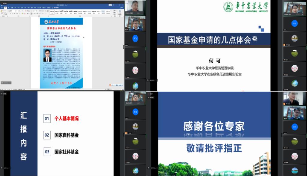 (通讯员:林龙飞)2021年12月11日下午2:30,williamhill中国邀请华中农业大学何可副教授讲授国家基金申报经验与注意事项。 本次会议通过腾讯会议线上举行,近70位师生参加了会议。会议由副院长何蒲明教授主持。
