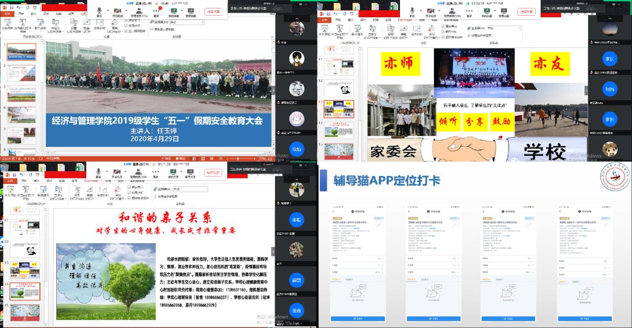 一是安全教育全覆盖无遗留。4月27日--30日,我院各年级各班分别召开了“五一”安全教育教育大会和线上家长会。班主任、辅导员通过雨课堂、腾讯会议、QQ群、微信群等网络平台,开展“五一”假期和疫情期间安全注意教育,重点围绕“防疫,交通,消防用电,防溺水,生活饮食,网络,居家心理,防诈骗”等八个主题展开,通过宣讲安全注意事项、列举案例、强调纪律等树牢学生安全意识。同时,学院在官网发布了安全提示,辅导员制作了安全教育PPT,学院还通过辅导猫平台开展了学生五一动向摸排,并给每一位学生发送了心理及安全提示。
