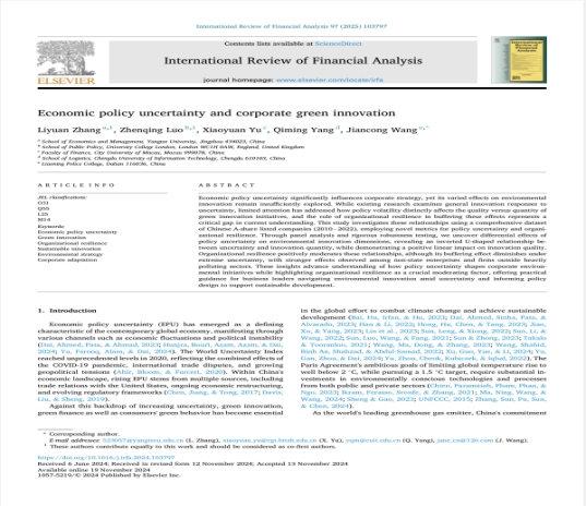 (通讯员:马晓娜)williamhill中国张力元老师(第一作者)与合作者的论文《Economic policy uncertainty and corporate green innovation》在国际知名期刊《International Review of Financial Analysis》(简称IRFA)发表。