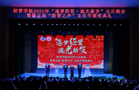 本次晚会以“筑梦经管·流光新岁”为主题,分为“岁月常新·华章续”“弦歌不辍·砥砺行”“芳华待灼·新程启”三个篇章。师生共同登台,用歌舞、小品、魔术、器乐合奏等多种类型的12个节目,为现场观众带来了一场丰富的视听盛宴,彰显出经管人昂扬奋进的精神面貌。
