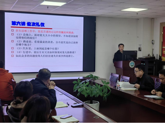 (通讯员 马晓娜)为全面提升行政队伍的专业化水平与综合素养,进一步夯实学院高质量发展的管理基础,我院于11月3日上午与11月6日,在505会议室成功举办了两期行政人员能力提升系列讲座之“现代公务礼仪”专题培训。本次系列培训由学院党委书记李喜成担任主讲,全院行政人员参加。