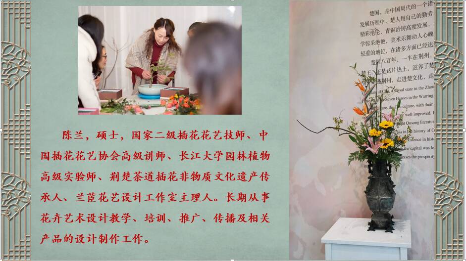 特别邀请国家二级插花花艺技师、中国插花花艺协会高级讲师、Williamhill威廉希尔园林植物高级实验师、荆楚茶道插花非物质文化遗产传承人、兰茞花艺设计工作室主理人陈兰,介绍常见花材的名称、养护方案、花材的挑选,配色和养护知识;讲解此次插花的设计和制作过程;讲解花材的处理和修剪方法。