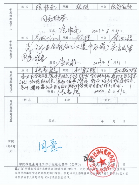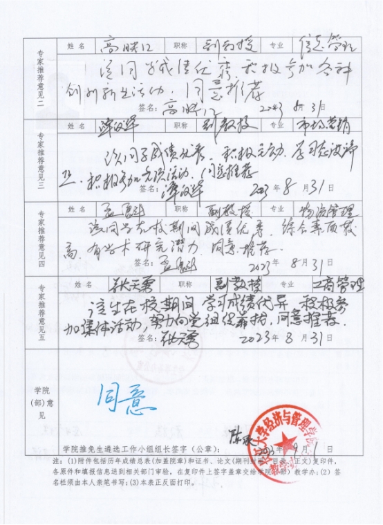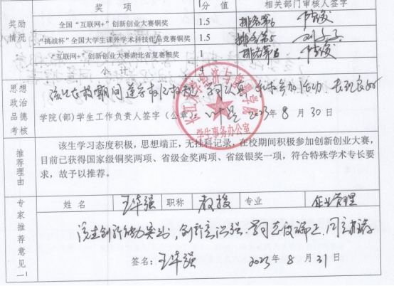 冯硕,男,学号202003175,学院信息管理与信息系统专业本科生。获得全国“互联网+”创新创业大赛铜奖 、“挑战杯”全国大学生课外学术科技作品竞赛铜奖和“互联网+”创新创业大赛湖北省复赛银奖;廖培霖,男,学号202004912,学院金融学本科生。获得第八届“互联网+”大学生创新创业国家金牌、第十三届“挑战杯”大学生创业计划竞赛国家银奖和第八届“互联网+”大学生创新创业省银奖。根据《Williamhill威廉希尔推荐优秀应届本科毕业生免试攻读硕士学位研究生管理办法(试行)》(长大校发 〔2020〕106号)和关于做好推荐2024届优秀本科毕业生免试攻读硕士学位研究生工作的通知》等文件精神和通知要求,9月1日13:00-13:30在文科大楼417开展特殊学术专长答辩会,经答辩决定同意冯硕和廖培霖进行2024届研究生推免申请(不是正式推免)。 现通过williamhill中国网站主页予以公示,公示日期为2023年9月1日至2023年9月3日,如有异议,请于2023年9月3日前与学院教学办联系,电话:0716-8060985。先将材料公示如下: