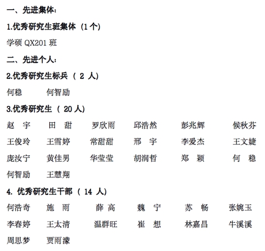 根据《关于评选 2020-2021学年研究生先进集体、 先进个人的通知》的文件精神,由学生本人或者集体自愿申报,班级民主评议,学院评审小组集中评审,拟推选出1个优秀班集体和赵宇等34位先进个人。具体名单公示如下: