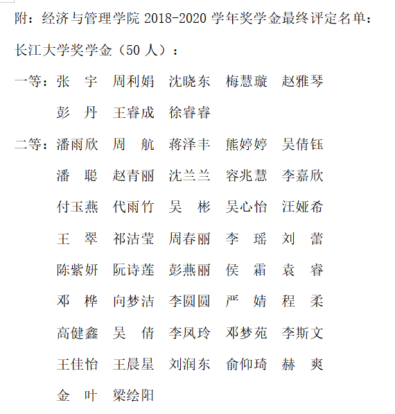 为激励我院学生勤奋学习、努力进取,使家庭经济困难品学兼优的学生通过自身的努力和学院资助顺利完成学业,帮助经管学院学子顺利成长成才,结合我院实际情况,我院认真进行了评选工作,根据个人申报、学院审核、最终评审,确定张宇等85人获评奖学金,特此公示。