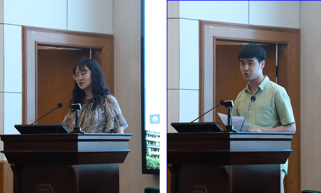 研究生代表胡晓双同学和胡润哲同学分别从个人视角分享了自己的学习与生活体验。在学习方面,他们提到研究生期间自主学习时间多需要较强自我主观能动性、保持对英语学习的热爱、也要关注实时新闻把论文写在祖国大地上;在生活方面,两位同学讲到游学经历,南大、厦大交流经历,鼓励同学们积极参与更多形式的活动,拓宽自己眼界。