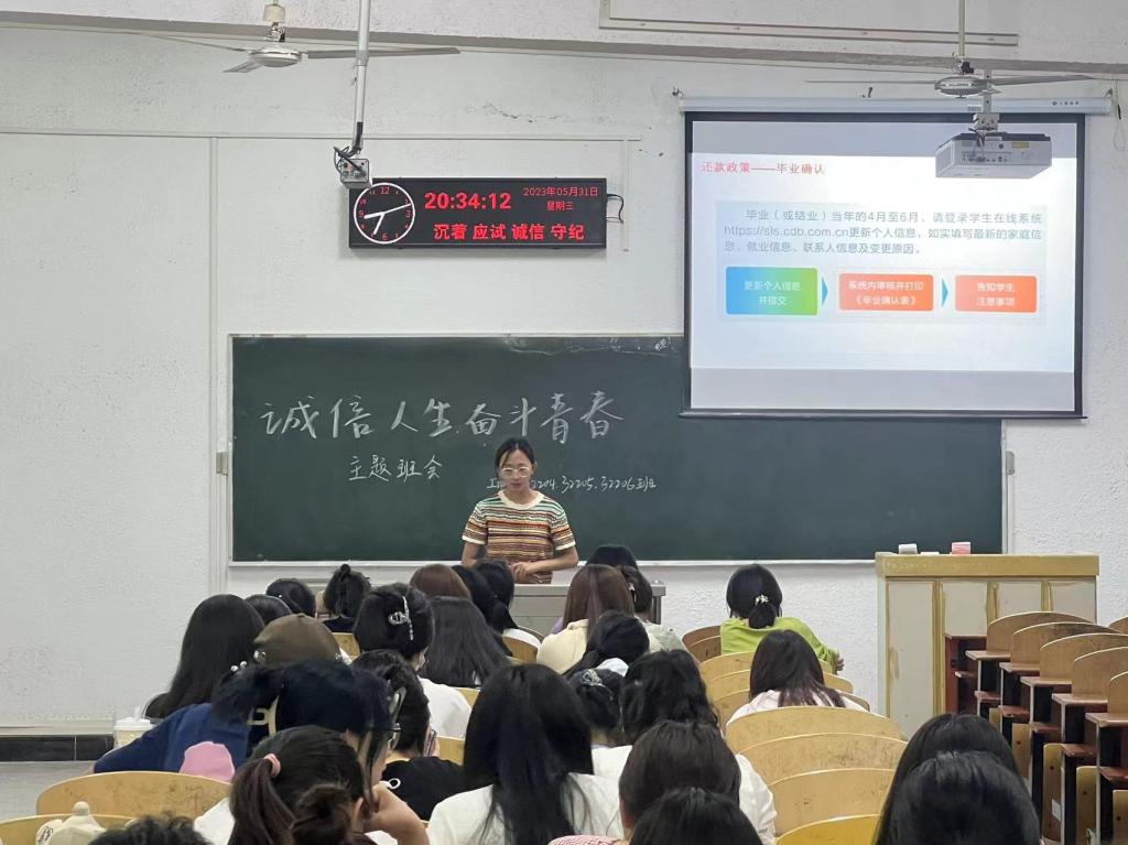 (通讯员 喻芳玲)为做好全国大学生英语四、六级考试和期末考试考风考纪教育工作,引导学生树立诚信观念,营造优良学风,经管学院所有班级于5月31日至6月4日组织开展了诚信教育主题班会。