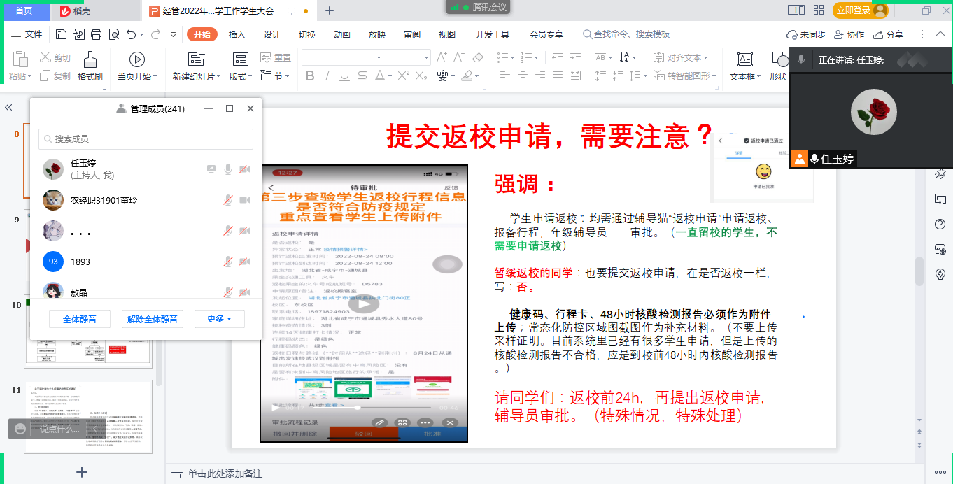 会上,主持人首先引导同学们认真学习了《新型冠状病毒肺类防控方案(第九版)》和学校疫情防控指挥部的相关文件和要求。然后分别从返校前、返校中和返校后三个时间段重点讲解了学生返校的各项要求和注意事项。学生报到实行先申请、后审批,经批准后方能返校,未经批准不得提前返校。返校前,同学们要按时完成今日校园进行为期14天的健康打卡,做好线上返校申请,上传个人健康码、行程卡和48小时以内的核酸阴性检测报告;返校途中,做好个人防护,注意交通和人身财产安全;返校后,要尽快完成学校安排的核酸检测。开学第一周实行“相对静态”教学运行模式,非必要不外出。最后,主持人对同学们提出的问题进行了一一解答。
