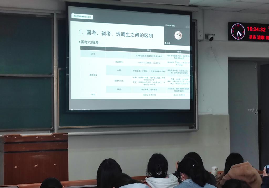 分享会伊始,汤旸学姐就“上岸绝非躺平”抛砖引玉,强调考公需要付出更多的努力,从心理准备开始,发自内心地认同党信任党,日常生活中以“准公务员心态”要求自己,关注时政新闻,注重日常积累;还要从自身定位出发,制定短期计划辅助长期计划,逐步达成个人目标。会上,汤旸学姐根据具体示例进行笔试做题技巧分享,播放的模拟面试视频更让大家身临其境,在场的同学们收获颇丰。最后,会计12001班吴婷婷对备考时间安排及相关学习方法提出疑问,汤旸学姐进行了详细解答。