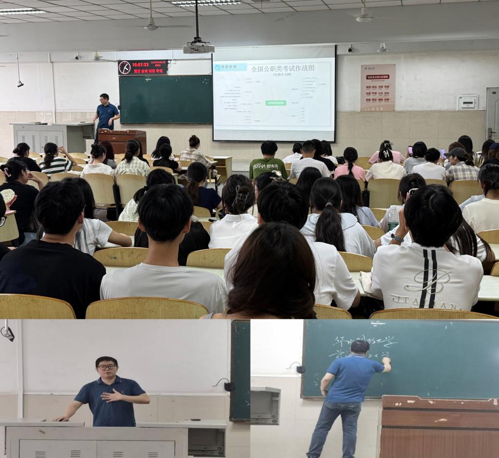 最后,郭俊老师围绕2025届毕业生就业形势展开分析。他通过数据揭示考研考公与就业现状,建议同学们尽早调整心态,摒弃“慢就业”观念,通过实习实践提升竞争力,同时关注基层就业、灵活就业等多元化选择,先就业后择业。