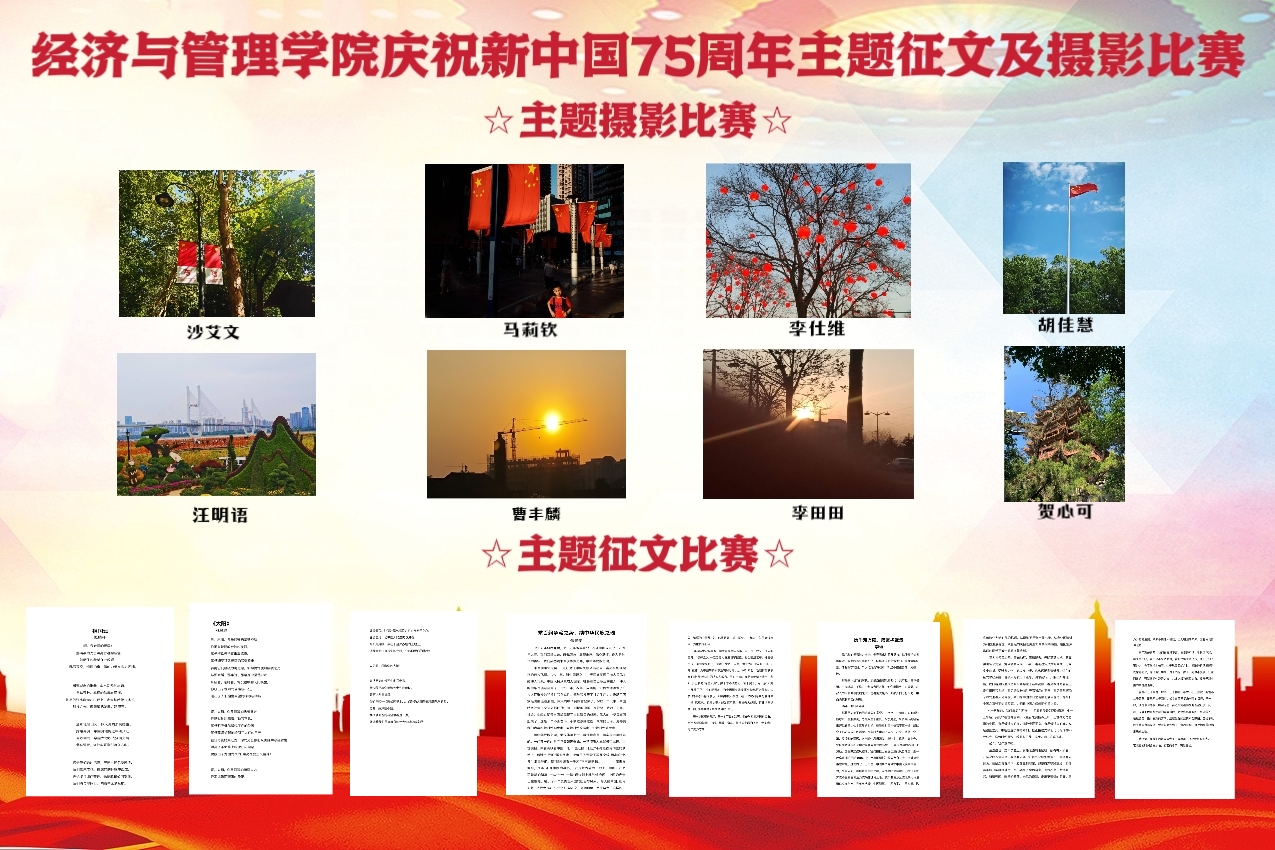 比赛过程中,评委们秉持公正、公平、公开的原则,认真评审每一份参赛作品。经过激烈角逐,最终评选出了征文和摄影比赛的各个奖项。主题征文比赛中选出张腾祥、 李杨等同学的10篇优秀征文,主题摄影比赛中选出沙艾文、曹丰麟等同学的20篇优秀作品,优秀作品在西校区行政楼宣传栏进行定期展示。此次征文征集及摄影展出活动不仅表达了新时代大学生对祖国的无限热爱和美好祝愿,为构建和谐校园文化氛围贡献力量,同时展现了中华优秀传统文化的无限魅力,增强了文化自信和民族自豪感,并激励经管学子努力学习,敢于创新,争做有为青年。