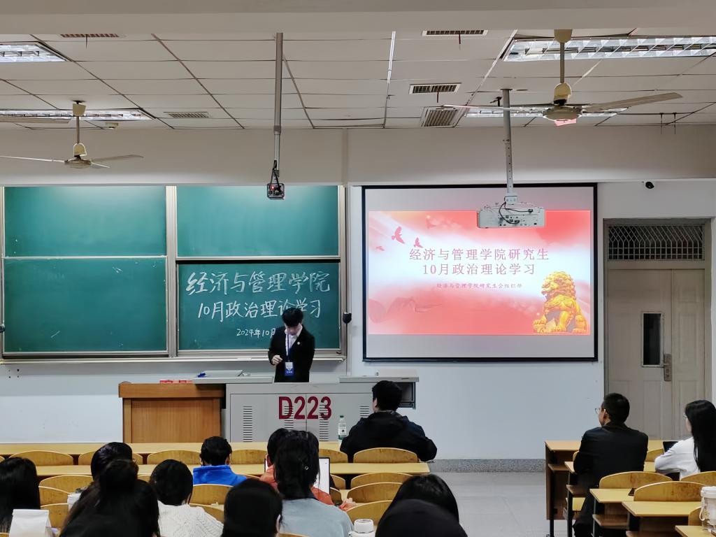 (通讯员 李瑞光)为深入学习习近平新时代中国特色社会主义思想,提升我院研究生政治理论素养,学院于10月28日晚7:00,在13教D-223教室开展十月政治理论学习活动。本次活动由研究生会组织开展,兼职辅导员潘永正、2024级研究生到会参加。