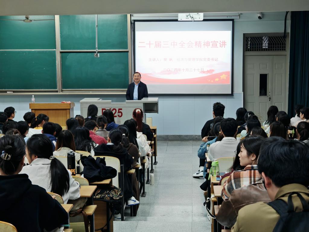 樊帆在宣讲中从“梳理和回顾改革开放以来党的历届三中全会”、“深刻领会和把握党的二十届三中全会精神”、“以改革创新聚力推动学校实现新突破”等方面作了系统宣讲和深入阐释。他指出,党的二十届三中全会通过了《中共中央关于进一步全面深化改革、推进中国式现代化的决定》,发出了新征程上将改革进行到底的动员令,擘画了进一步全面深化改革的全景图,要深刻领会、准确把握全会的重大意义,把学习宣传贯彻全会精神作为当前和今后一个时期的重大政治任务;要创新学习方式,凝聚工作合力,精心组织实施,确保学习实效;要原原本本学、全面系统学,持续深化学思践悟,切实做到融会贯通,以学促干、以知促行。