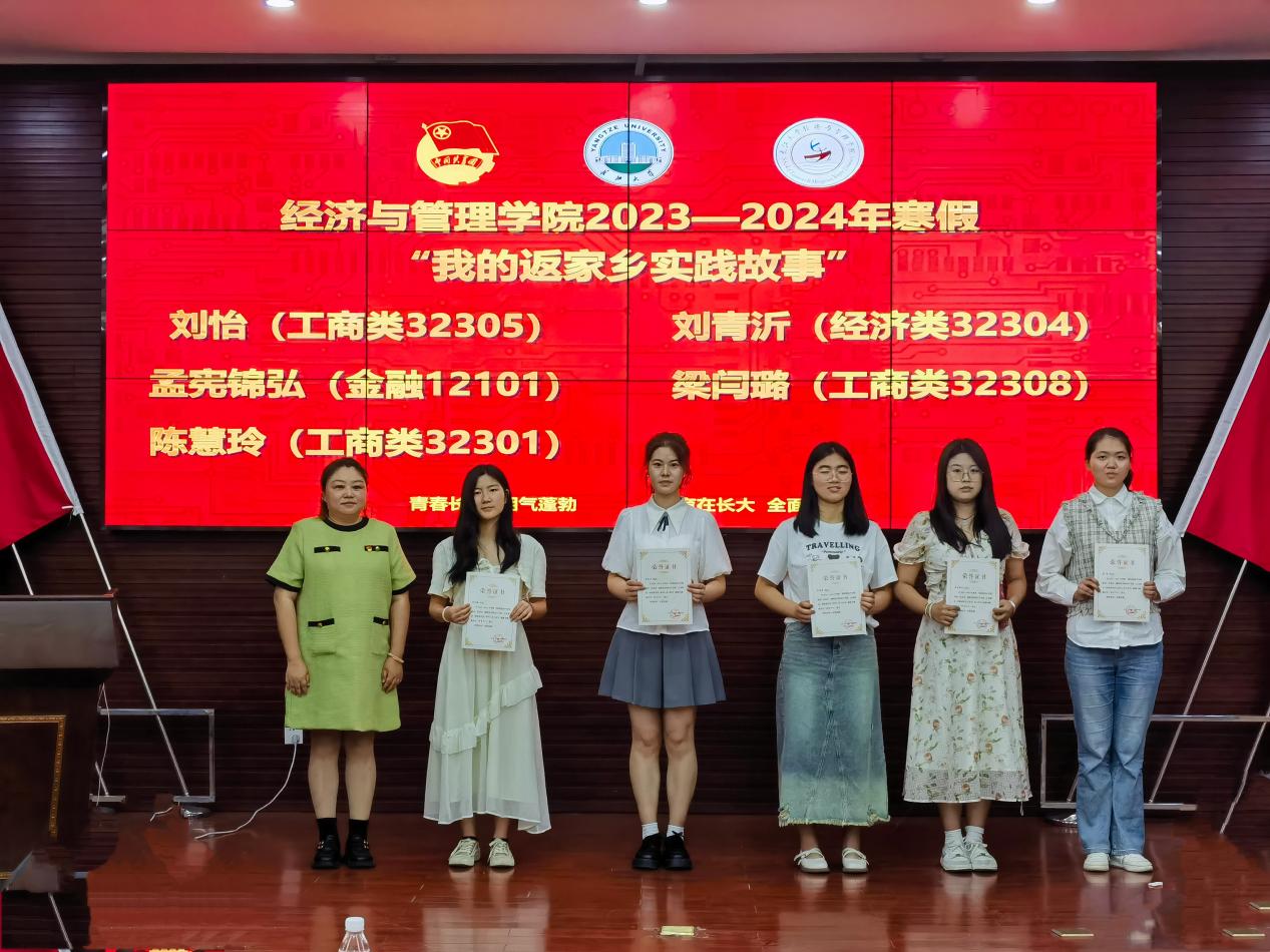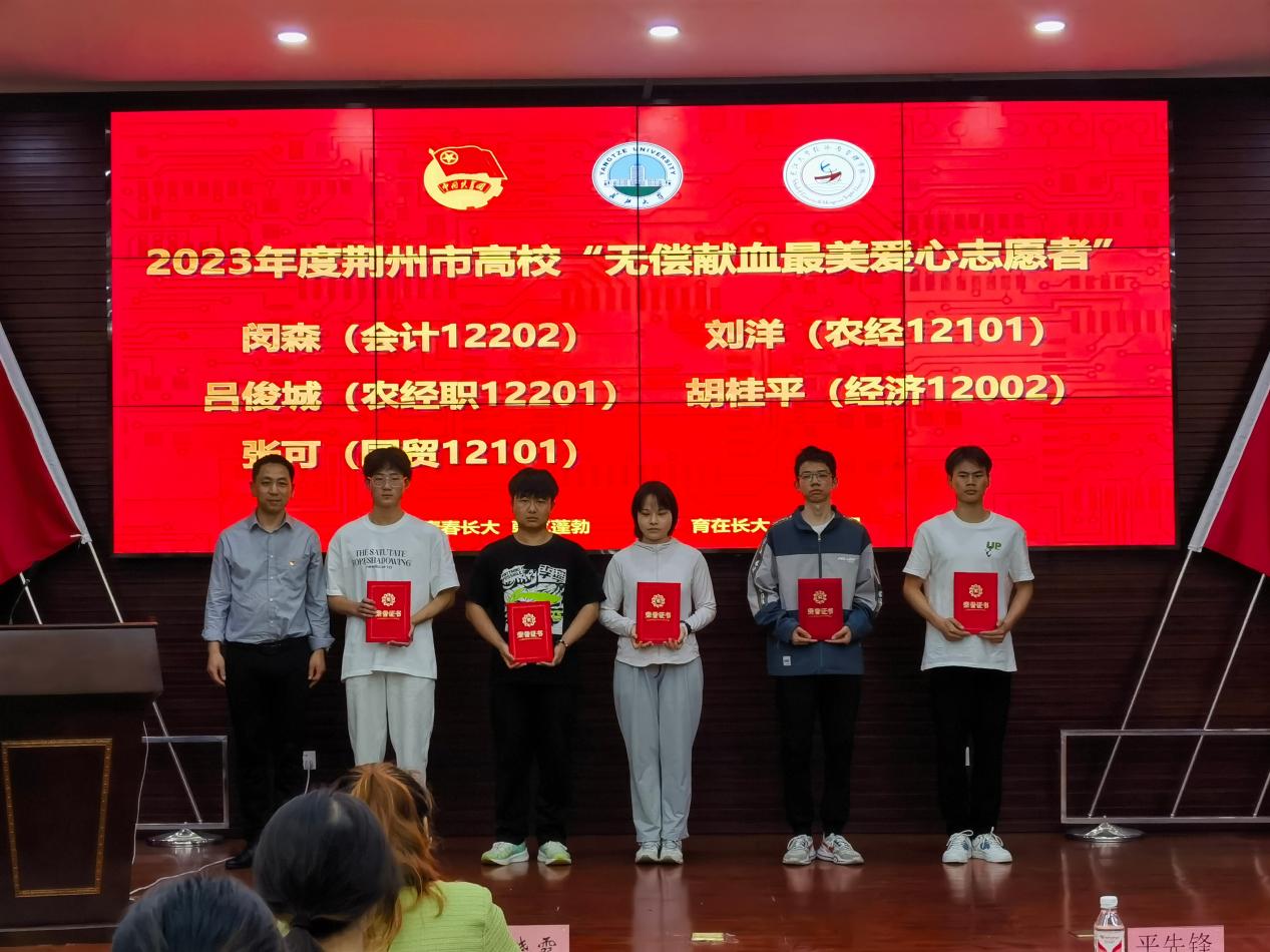 主持人王璐佳宣读学院志愿服务表彰文件,会计12202班闵森、农经职12201班吕俊城、国贸12101班张可、农经12101班刘洋和经济12002胡桂平5名同学获2023年度荆州市高校“无偿献血最美爱心志愿者”,工商类32305班刘怡、金融12101班孟宪锦弘、工商类32301班陈慧玲、经济类32304班刘青沂和工商类32308班梁闫璐5名同学获经管学院2023—2024年寒假“我的返家乡实践故事”优秀个人,大家先后上台接受表彰。