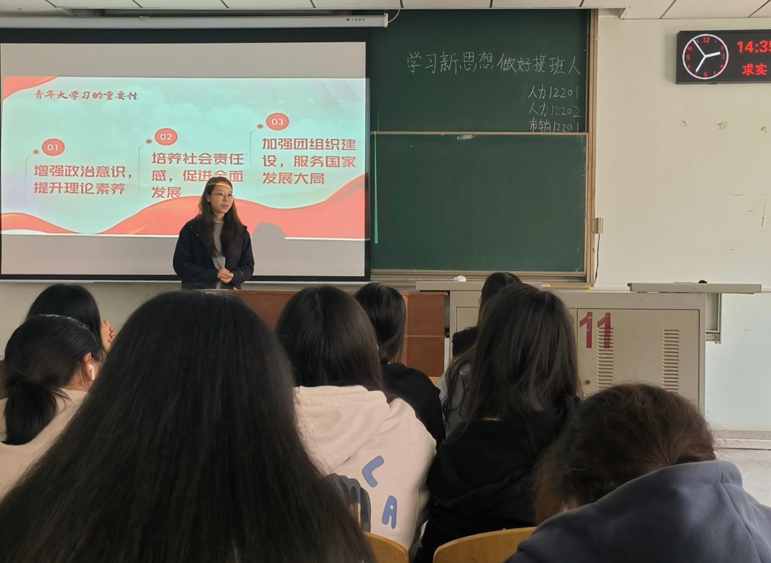 会后,经济12202班宋天姿与方含之老师交流道:“通过本次主题团会我深刻领会了习近平总书记系列重要论述精神的实质和实践要求,我们要以实际行动践行新思想,做好接班人,为实现中华民族伟大复兴的中国梦贡献青春力量。”