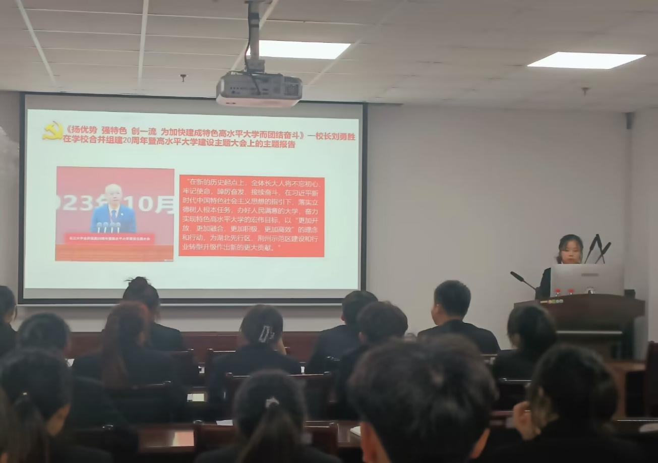 在活动的最后,俞钰婷同志着重对刘勇胜校长在学校合并组建20周年暨高水平大学建设主题大会上的主题报告进行讲解。刘勇胜校长强调:我们要把立德树人成效作为检验学校一切工作的根本标准,始终把人才培养质量放在首位,持续构建“育在长大”育人品牌,着力培养担当民族复兴大任的时代新人。