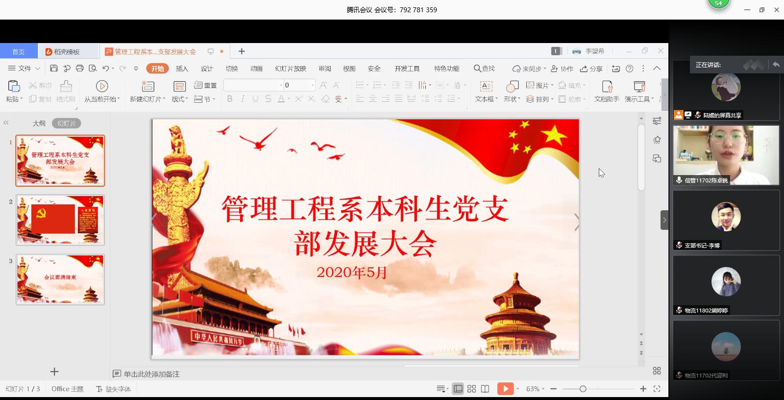 2020年5月25日下午2点,williamhill中国管理工程系本科生党支部在腾讯会议上召开了党员发展大会。会议主要目的是讨论关于发展陈卓锐等6名同志为预备党员的事宜,本次会议由陆媛主持,参加人员主要有管理工程党支部书记李博老师、8位正式党员、14位预备党员以及6位发展对象。