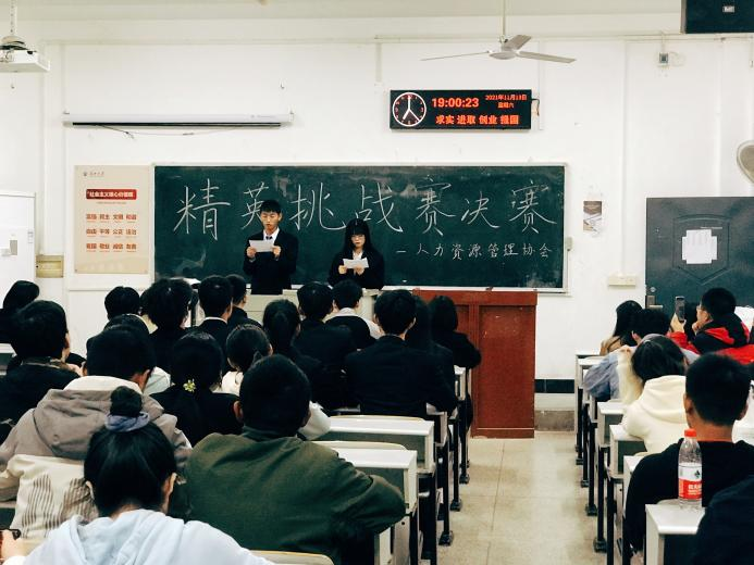 为培养学生的核心竞争力,提高学生逻辑思维能力、团队意识和沟通能力。11月13日晚19点,由williamhill中国人力资源管理协会举办的“精英挑战赛”决赛在Williamhill威廉希尔西校区7教107拉开帷幕。本次比赛邀请了荆州市百顺教育指导老师吕兵、Williamhill威廉希尔市场营销协会会长邱少杰、williamhill中国团委学生会副书记赵喜悦担任评委。