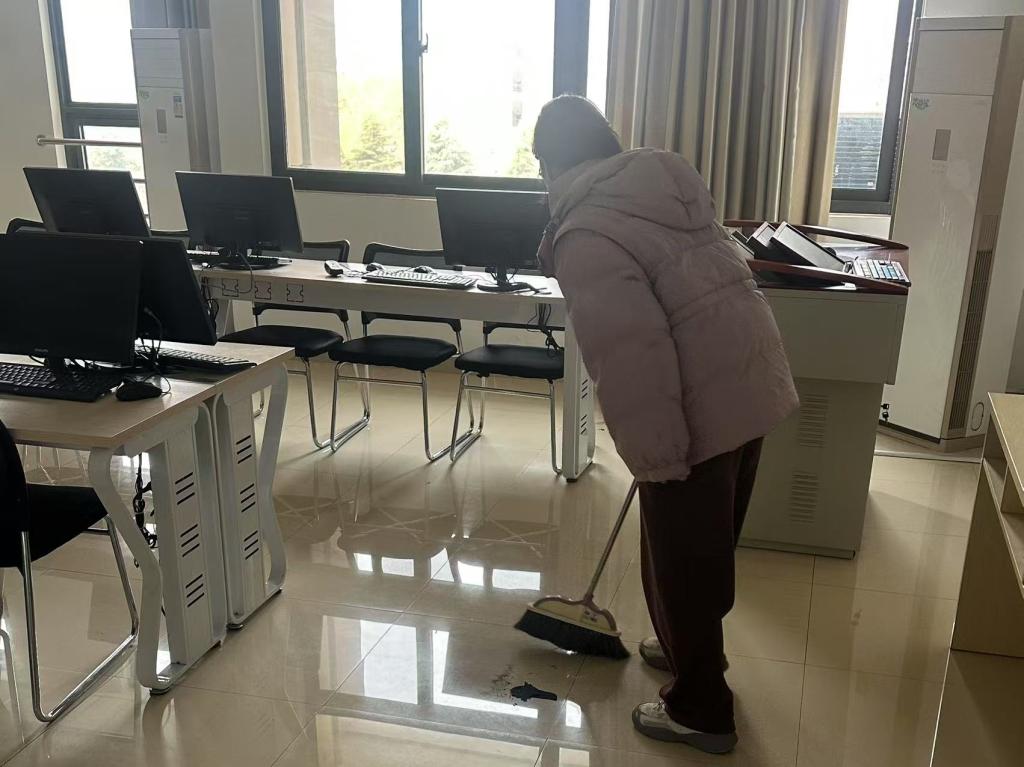 活动当天,志愿者们携带扫帚、抹布、消毒工具等清洁物资,在实验室老师的指导下分组行动。三、四楼实验室的清扫任务包括地面清洁、实验台面擦拭、仪器设备分类摆放、资料归档整理等。志愿者们细致排查卫生死角,对精密仪器进行除尘维护,确保实验室环境整洁有序。