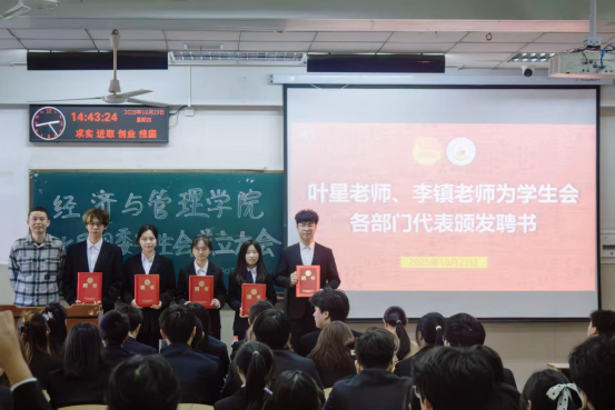 大会在庄严的国歌声中拉开帷幕。第六届团委学生会主席团代表张丽作年度工作汇报,系统性总结了过去一年的工作经验与成果。随后,团委书记杨雪老师宣读第七届团委学生会聘任文件,叶星老师与李镇老师共同为各部门学生代表颁发聘书。
