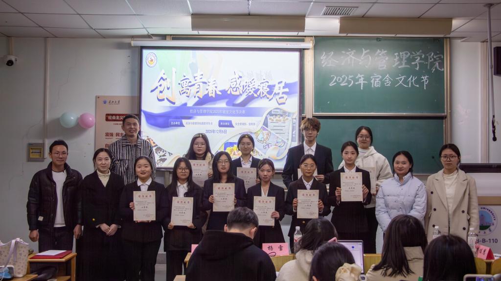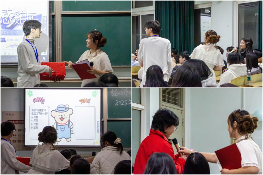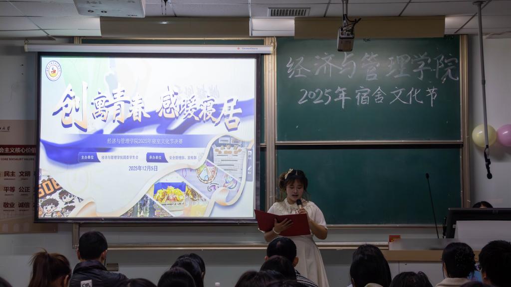 (通讯员 李镇 任鹏)为强化宿舍成员间团结协作的精神,培养温暖和谐的宿舍氛围,引导学生营造舒适整洁、安全健康的宿舍环境,12月5日晚7:00,学院在东校区13教B110教室举行2025年宿舍文化节决赛答辩会。学院学工办主任叶星、团委书记杨雪、辅导员李镇以及兼职辅导员代表、学生代表担任答辩评委,来自各年级的近百名同学到现场观赛。