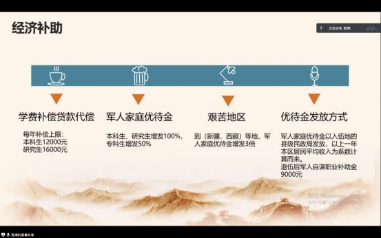 会议伊始,我院优秀退役大学生殷博同学从大学生应征入伍程序、基本条件及优惠政策等方面就2022年大学生应征入伍工作的相关安排和政策进行了详细的宣讲,重点介绍了低年级学生和毕业生参军入伍后发展路线的区别。