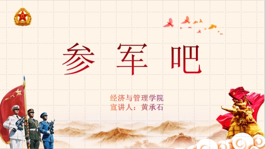 (通讯员 黄承石)为深入贯彻全国大学生征兵工作会议精神,做好2020年大学生征兵宣传教育工作,帮助在校大学生了解今年的征兵政策,激发广大学生参军入伍积极性,我院征兵专干黄承石老师分别于4月30日和5月1日,在各年级开展了以《参军吧》为主题的征兵“云”宣讲活动。