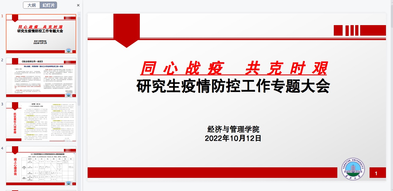 (通讯员:彭书范)2022年10月12日晚,同心抗疫,共克时艰,经管学院召开了研究生疫情防控工作专题大会,研究生辅导员朱翠玲和黄承石老师主持和参会,学院全体研究生参加会议。