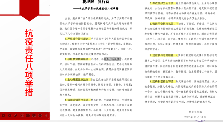 会议伊始,朱老师传达了学校党委发布的《致全校师生的一封信》和学生工作部发布的《长大学子勇担抗疫责任八项举措》,向学生介绍了疫情防控相关文件精神。要求我院研究生严格遵守管控规定,积极参加核酸检测,主动开展健康监测,珍惜医疗资源,规范参与志愿服务,养成良好卫生习惯,构建和谐宿舍环境,营造同心抗疫氛围。