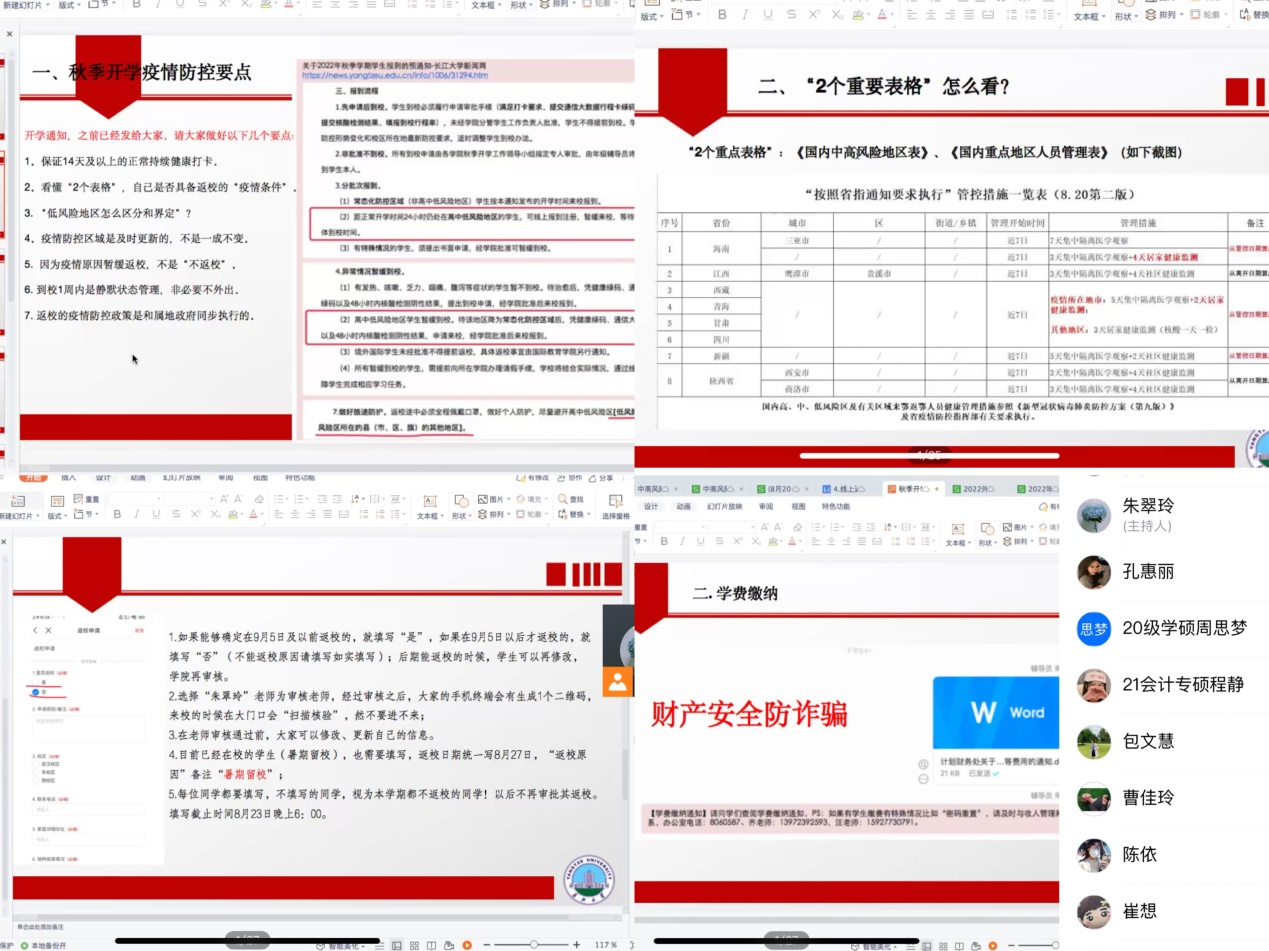 会议上,朱老师对学生安全返校及新学期疫情防控工作进行了安排与部署,根据属地政府和学校政策要求,讲解了目前疫情形势,重点围绕国内中高低风险地区以及国内重点管控人员两个表格分析相关细节。她强调并要求同学们做到“坚持14天健康打卡”、“看懂2个表格”、“认真提交返校申请”。朱老师引导同学们学习《新型冠状病毒肺类防控方案(第九版)》及省疫情防控指挥部有关要求贯彻落实,及时关注所在地区监管规定,安全返校、规范入学。