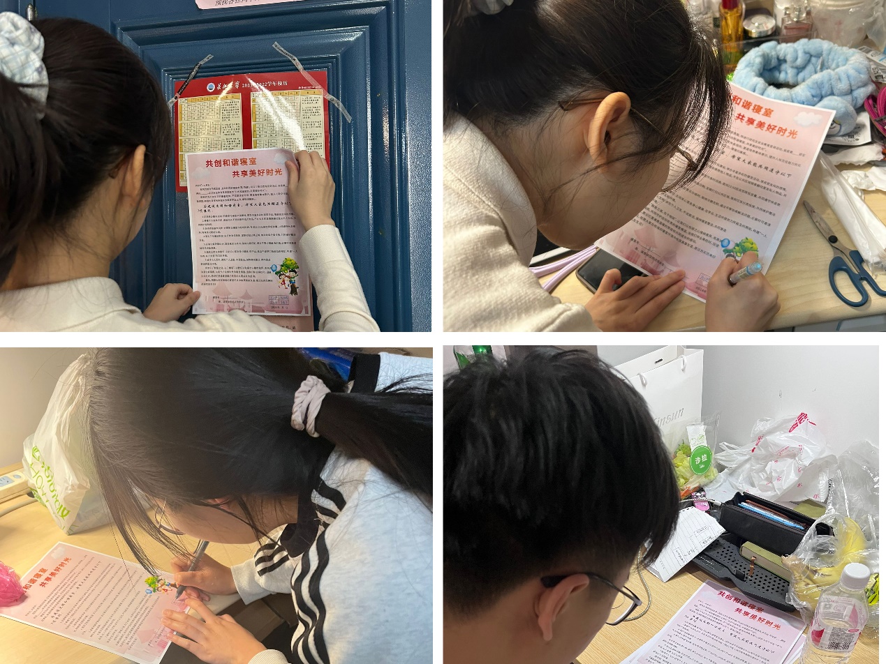 活动现场,宣讲员结合典型案例分析寝室矛盾成因,组织同学们分组讨论如何建立良好室友关系。2024级硕士研究生吕同学分享道:“我们寝室设计了'心愿便利贴'墙,有意见随时写出来,大家一起想办法解决。”互动环节中,同学们踊跃提出制定“寝室公约”“设立共享物品角”等创意方案。宣讲结束后,同学们以宿舍为单位,纷纷在宣传页上签字,并张贴于寝室门后,时刻提醒自己践行责任。