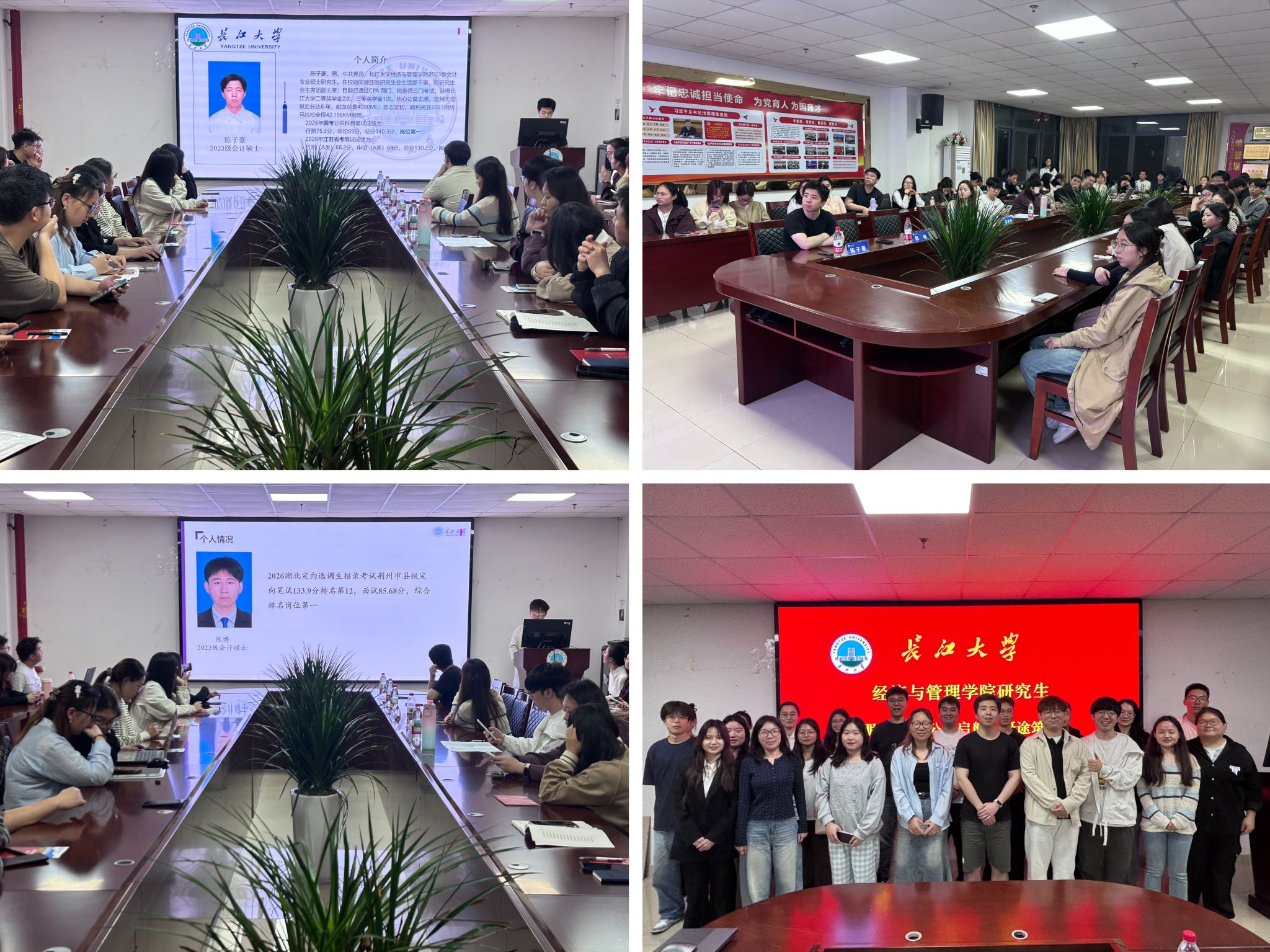 (图/贾贵仓 文/彭春雪)为帮助研究生明晰公考备考方向,掌握科学备考方法,4月27日晚,学院在文科楼505会议室举办第七期研究生朋辈讲堂。活动以“公考启航,研途筑梦”为主题,特邀优秀学生代表陈子豪、陈博主讲,研究生辅导员贺雄、兼职辅导员陈梦冉及学院研究生代表参加,现场氛围热烈浓厚。