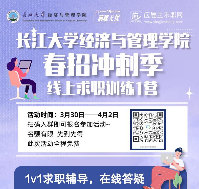 本次线上训练营是由我院与前程无忧共同合作举办的活动,全程线上,共4天,名额有限,先到先得,1对1指导,推荐就业单位,让大家“求职无碍,就业无忧”!!!扫码即可添加!!!