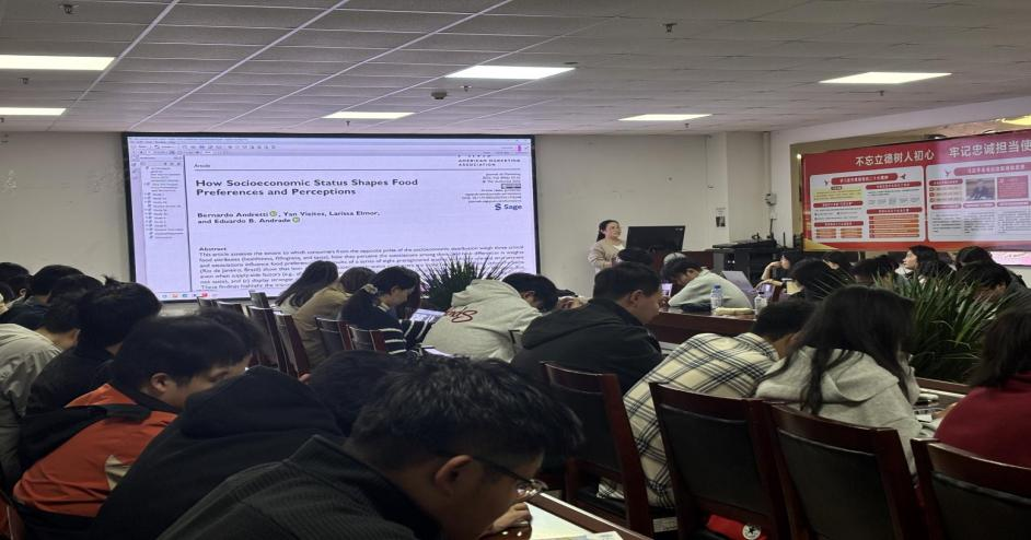 张董敏博士首先从行为经济学视角出发,阐释了个体在信息不对称与决策压力下的认知规律。她指出,行为偏差往往并非源于非理性,而是个体有限理性与信息处理方式差异的必然结果。这一理论框架为后续文献解读奠定了坚实基础。张老师带领同学们解读了两篇发表于国际权威期刊的最新研究。第一篇是Bernardo Andretti等人发表的《How Socioeconomic Status Shapes Food Preferences and Perceptions》,该研究发现低收入群体更倾向于选择“饱腹感强”的食物,并普遍认为健康食物“不够饱腹”“不够美味”,这种认知偏差构成了健康饮食推广的结构性障碍。第二篇是Jochen Reiner等人发表的《How Insurance Prices Affect Consumers‘ Purchase Decisions: Insurance Price as a Risk Signal》。研究揭示,保险价格不仅影响购买成本,更会被消费者解读为风险信号——高价往往被视为高风险,从而抑制购买意愿。这一发现对理解价格信号在不确定性决策中的作用具有重要启示。
