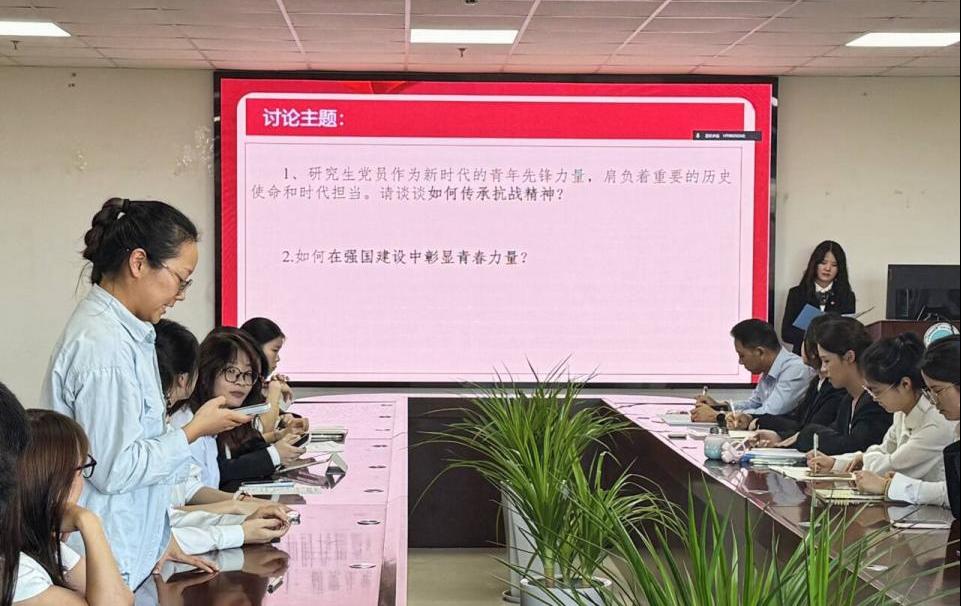 在主题研讨阶段,支部党员围绕两大议题开展热烈讨论。针对“研究生党员如何传承抗战精神”,张余娟同志认为研究生党员传承抗战精神,要以初心为锚、行动为帆,将家国情怀化科研动力、以宣讲激活红色基因、用担当投身实践,让其在新时代绽放光芒;在“如何在强国建设中彰显青春力量”讨论中,李浩洁表示新时代青年需坚定理想信念、苦练本领、勇于担当,将爱国情、报国志化为行动,汇聚成推动民族复兴的青春力量。
