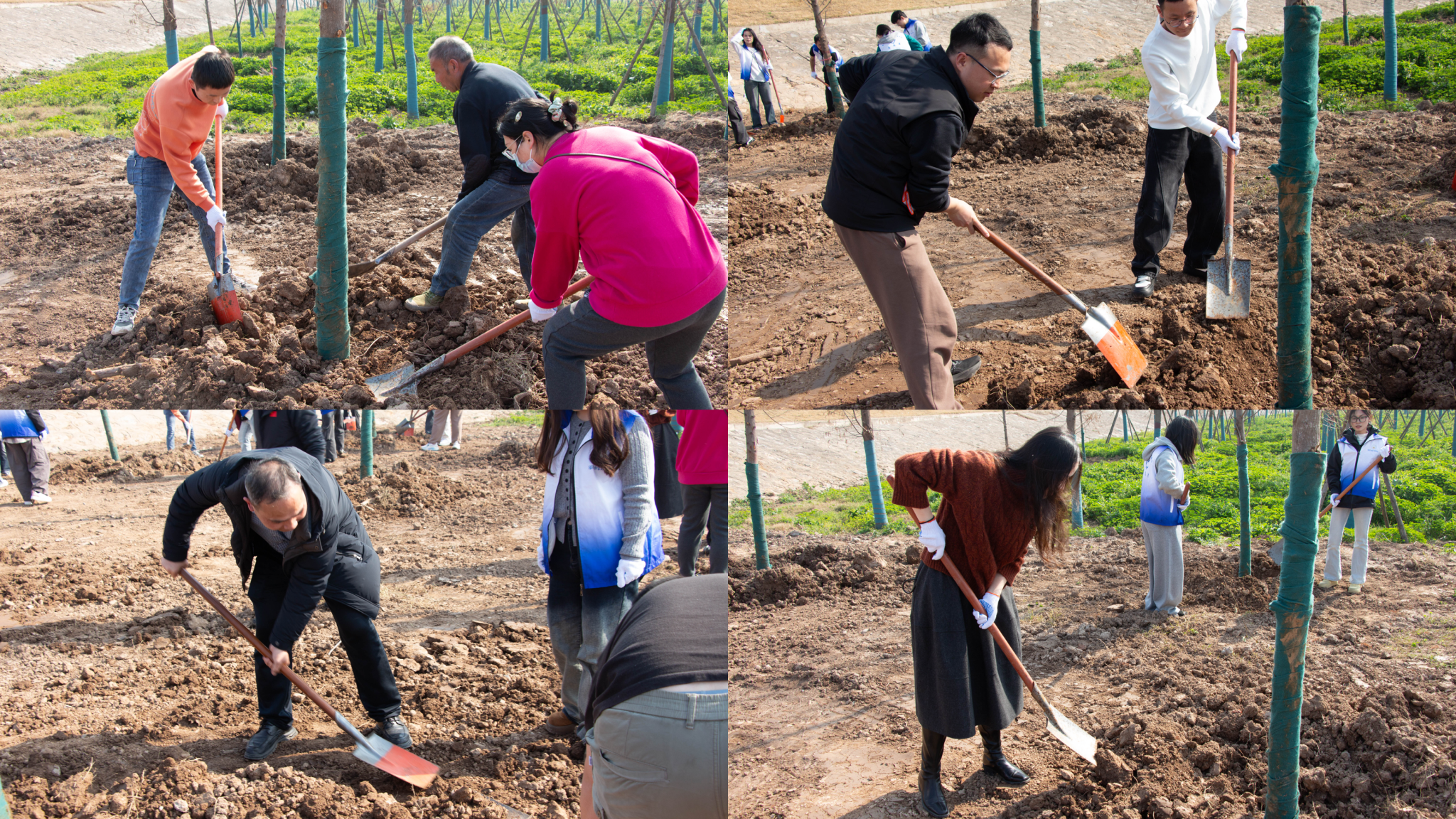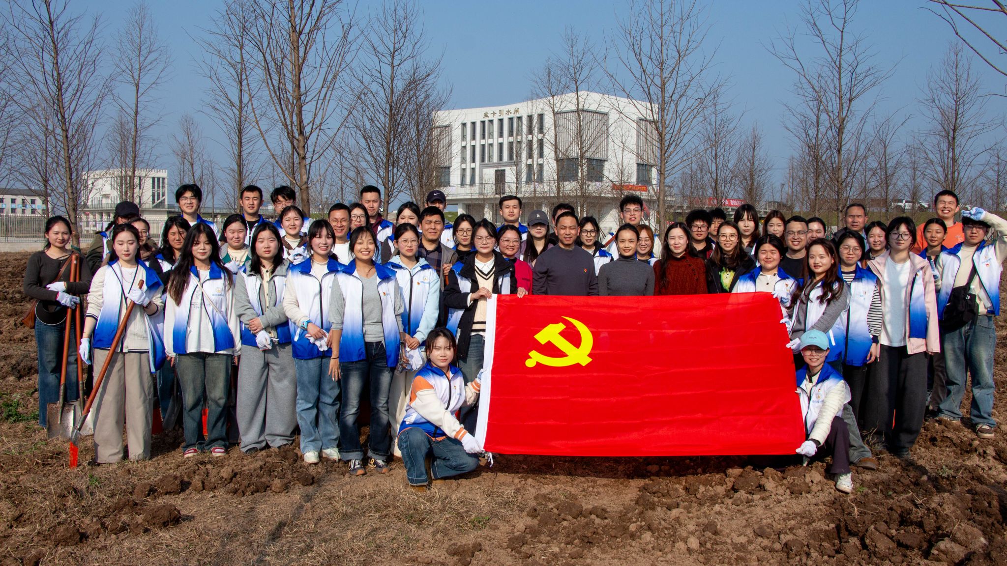 下午3时许,阳光和煦,尽管位于长江之滨的盐卡泵站附近泥土松软、地势起伏,但同志们热情高涨,迅速投入到劳动中。在场地技术人员的指导下,大家认真学习植树要领,党员们三两成组,分工协作,挥锹铲土、扶苗填坑。现场一派热火朝天的景象,青春的汗水与泥土的气息交织,新生的树苗在江风中昂然挺立。